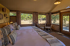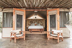 Die Zelte im Little Makalolo Camp sind ein wunderschönes Beispiel für klassisches Safari-Design mit modernem Komfort. Insgesamt gibt es sechs geräumige Zelte, darunter ein Familienzelt, die alle auf erhöhten Holzplattformen stehen und einen herrlichen Blick in die weite Savanne bieten. Jedes Zelt verfügt über ein en-suite Badezimmer mit Innen- und Außendusche, Solarstrom, bequeme Betten mit feiner Bettwäsche und liebevolle Details.
