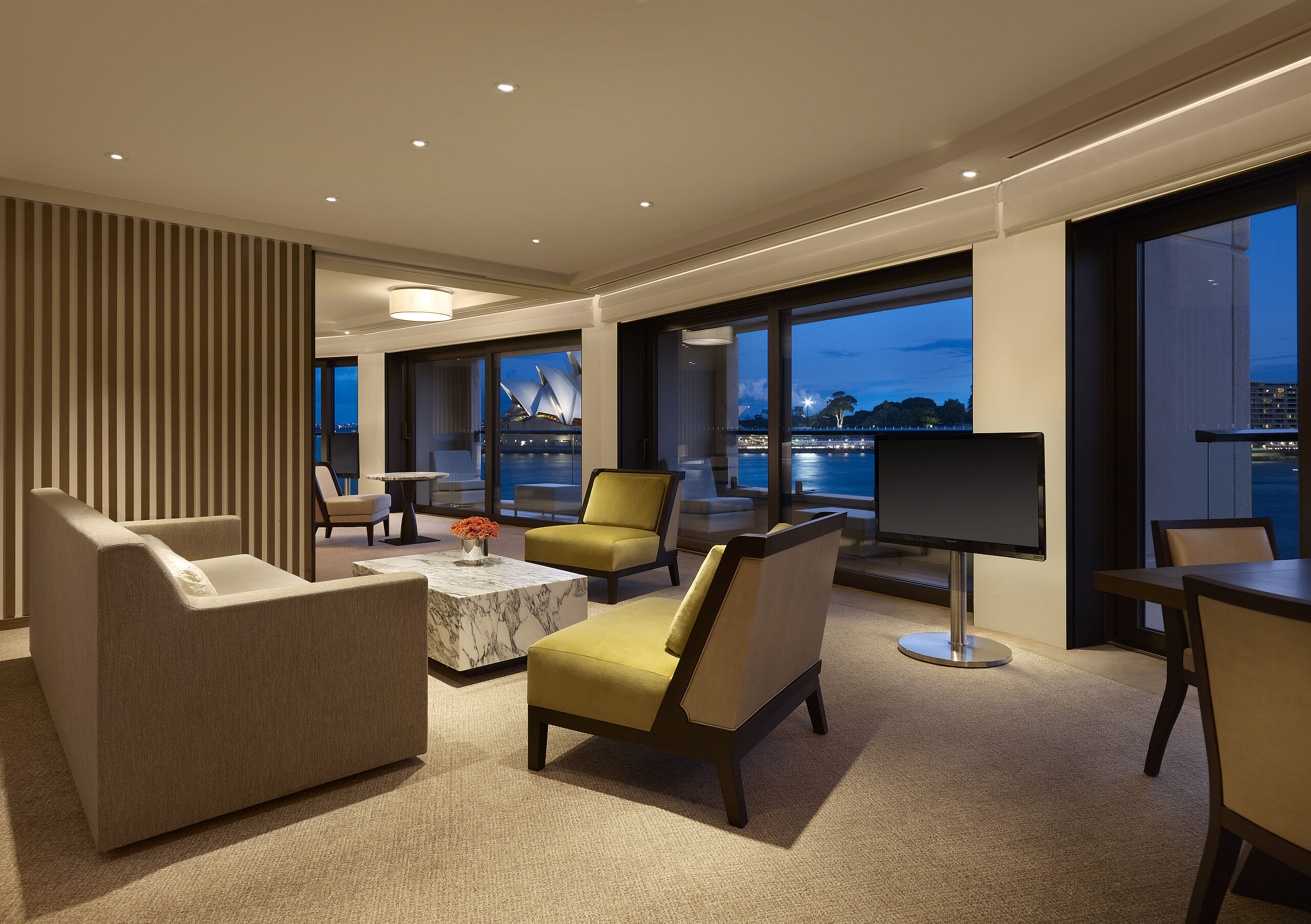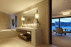 Die größte Suite des Park Hyatts, die Sydney Suite, bietet auf 350qm zwei Schlafzimmer, eine private Sauna und eine moderne Küche. Genießen Sie Ihr Dinner auf Ihrer Terrasse mit Panoramablick auf die Oper, die Harbour Bridge und den Hafen oder in der Suite mit Platz für bis zu acht Personen. Für romantische Stimmung sorgt ein Kamin in der Sydney Suite.